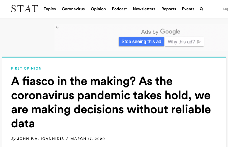 Such large % people all around world have been scared by this that only way for Trump, allies to move nation away from Fau*ci-Gates-Chyna hysteria op is to promote Expert (TM) doctors with opposing views. Start by promoting Ioannidis @DonaldJTrumpJr statnews.com/2020/03/17/a-fi…