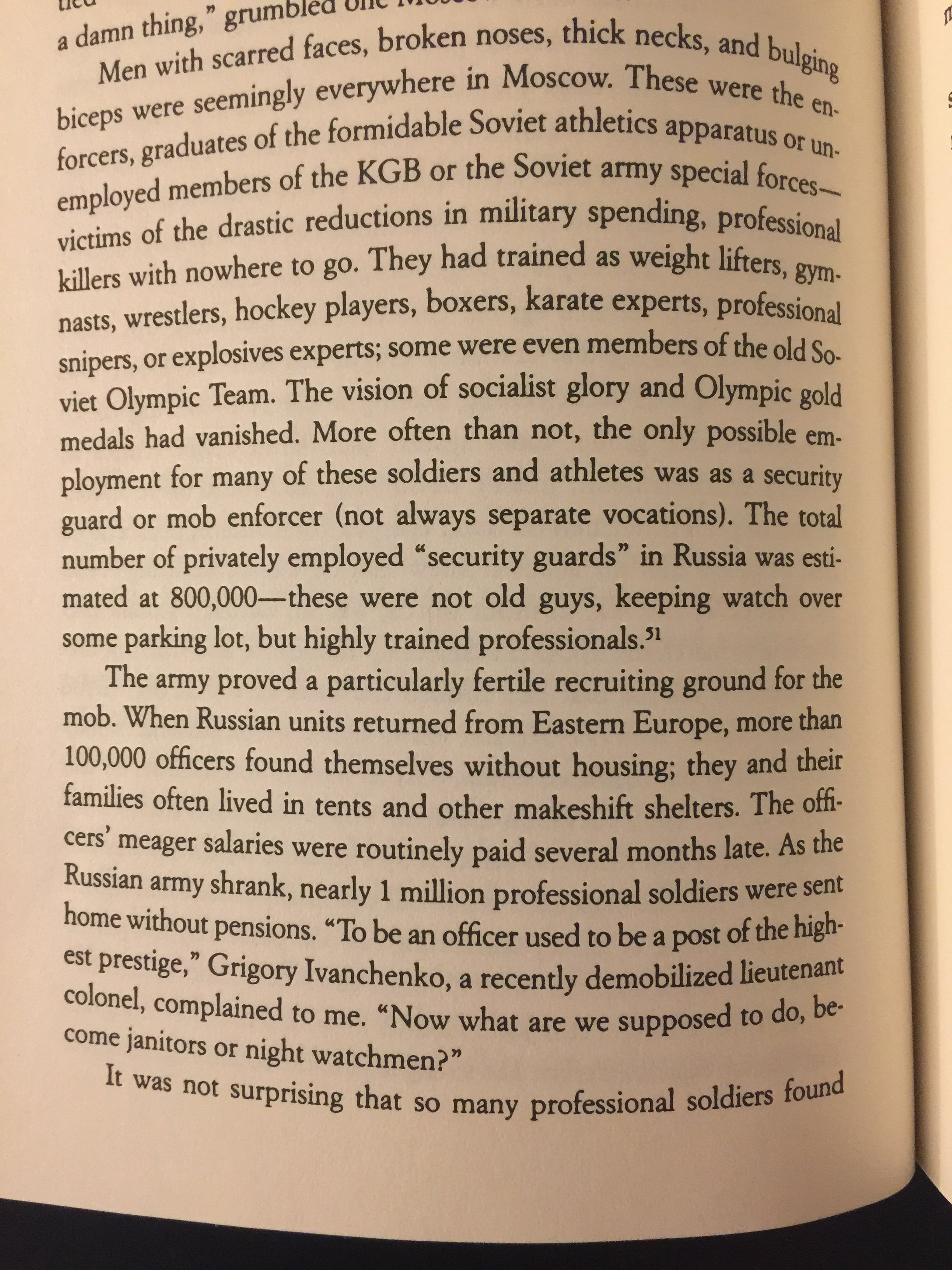 Moscow in early 1990's..."men with scarred faces, broken noses, thick necks, and bulging biceps were seemingly everywhere in Moscow."