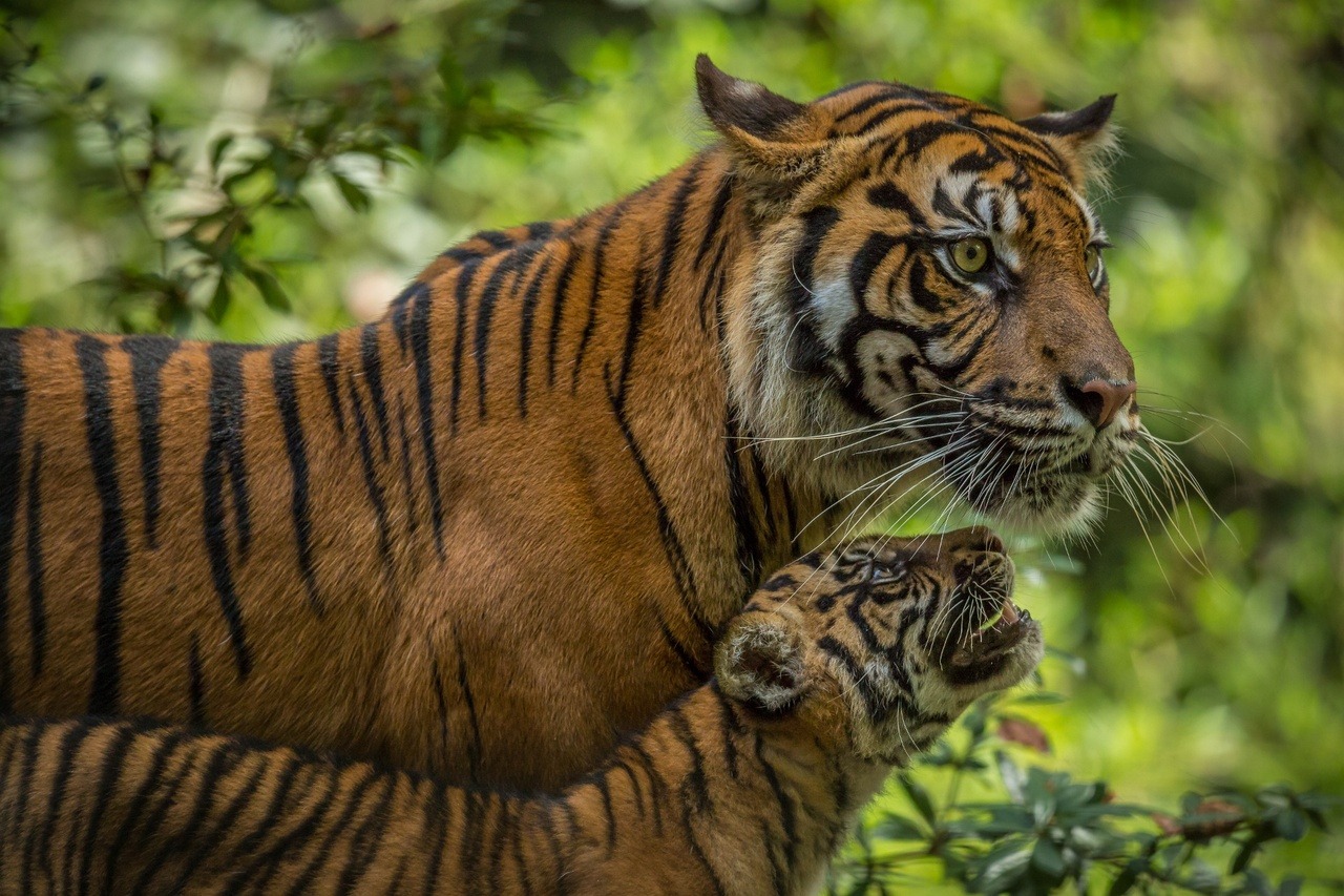 Tiger cub looks for instruction in hunt art from mother, she is aided in hunt skill by a touch of the 'tism see look in eye #BigCatMonday