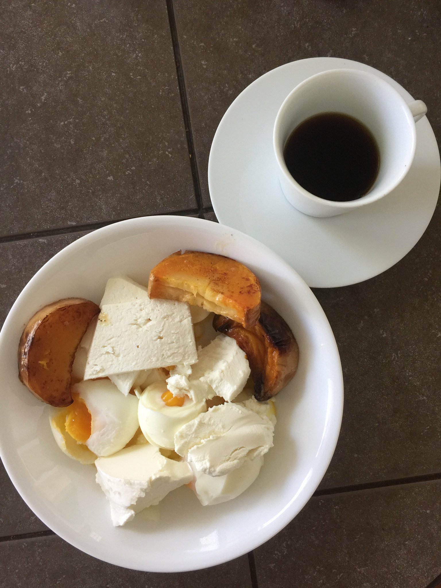 Since everyone enjoys food poasting, here my latest breakfast: 4 soft boiled eggs, butter, goat cheese and sour cream, and baked butternut squash (I think?) that I reheated in butter
