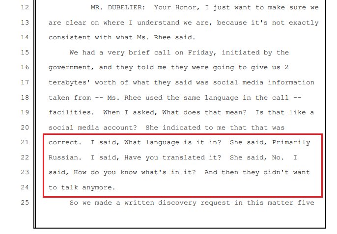 Another great exchange, as described by the Defense. Rhee: We have 2tb of social media data. Defense: What language is it in? Rhee: Russian. Defense: Have you translated it? Rhee: No. Defense: Then how do you know what's in it? Rhee: [silence]