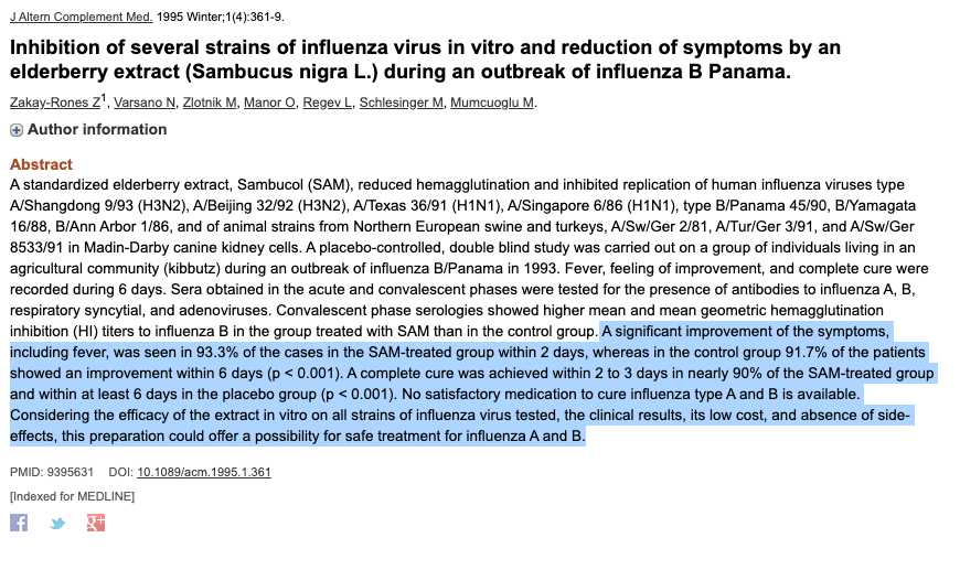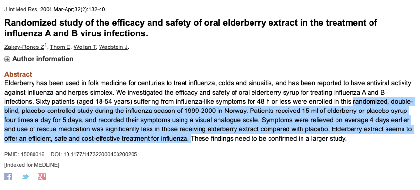 The snotnoses smirking at elder*berry...do they know there are more THE SCIENCE (tm) studies (and with better evidence) for efficacy vs Tam*flu (which relies on fake 3d world stats)? ncbi.nlm.nih.gov/pmc/article… ncbi.nlm.nih.gov/pubmed/3067… ncbi.nlm.nih.gov/pubmed/1508… ncbi.nlm.nih.gov/pubmed/9395…