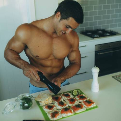 Aussie bodybuilder makes fancy snaq with gravlax and creme fraiche, he demands you protecc animool on #HandsomeThursday