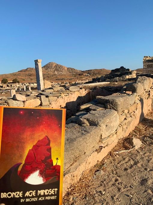 Reader submission: powerful energies as he presents my book at sanctuary of Delos, birthplace of Apollo. Old frands sleep, but they always wake up again...