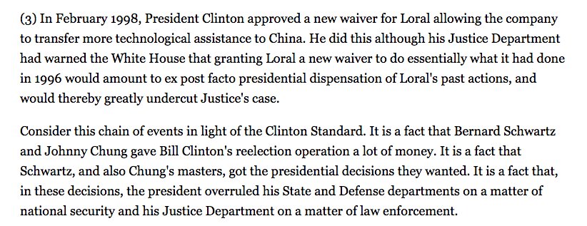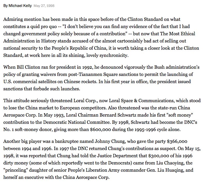 1998 article in Washington Post by Michael Kelly short explanation of how Clinton was bribed by Bernie Schwartz of Loral Space Corp and Johnny Chung into giving China vital ICBM missile tech, over objections from Pentagon washingtonpost.com/archive/o…