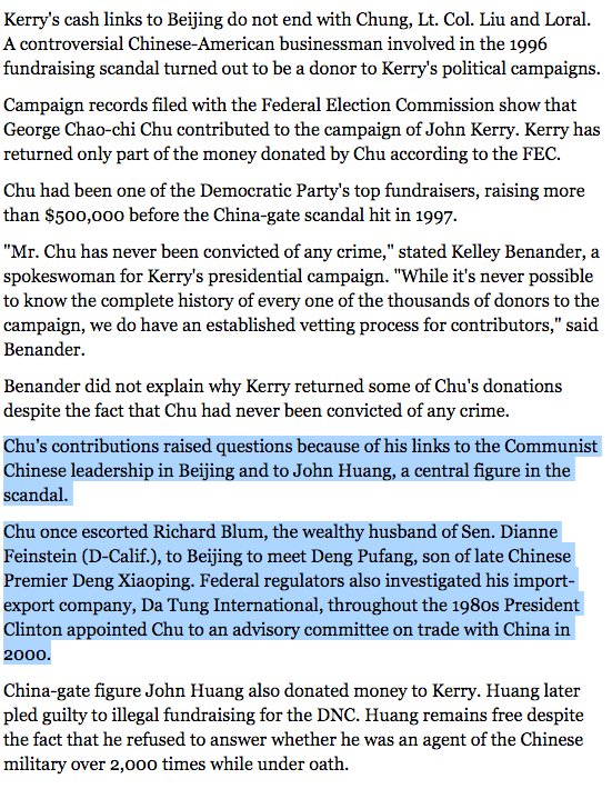 newsmax.com/pre-2008/kerry-s… Contributions from Chinese govt continued...Yes the same figures were connected to Feinstein and to her husband Blum's business relationships in China. Note date: Chu appointed in 2000 trade committee on China; Molycorp Mountain Pass mine shut down 2002