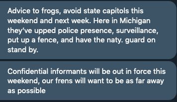capitol riot & MMM marches showed that hinterland volk are ready to be mobilised.. so why not join them in their irl show-of-force? previous poster is correct- snarking has reached limit of utility and we will be censored by big tech before making meaningful impact on normies